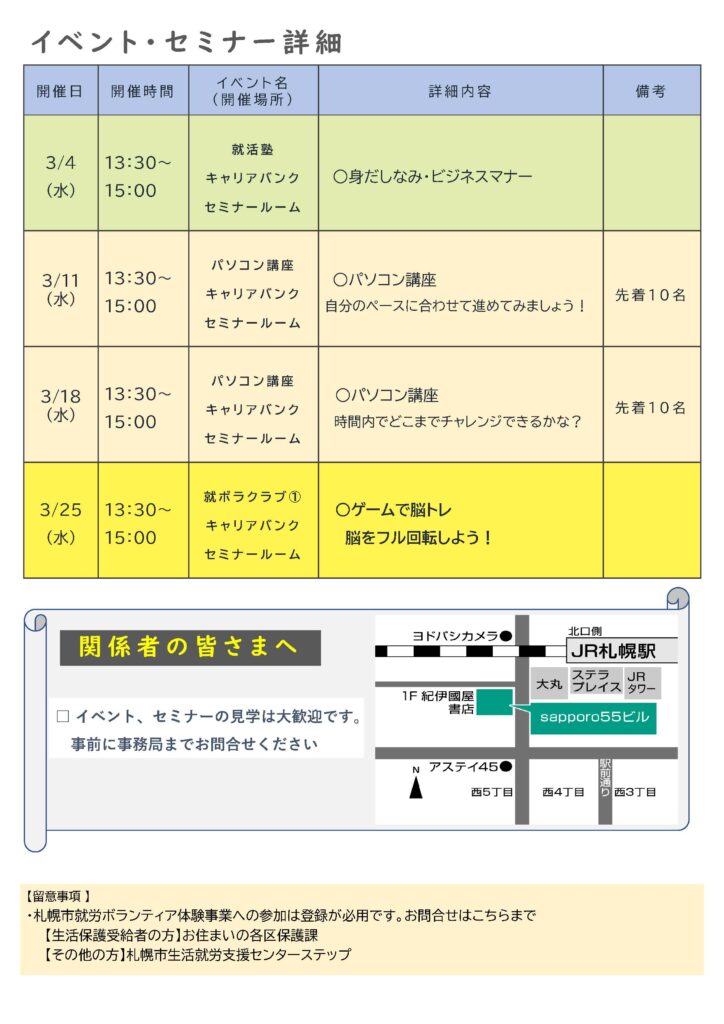 お知らせ 2026年3月の体験イベント・講座のお知らせ 2026.02.04 お知らせ 3月の就ボライベント・講座スケジュールをお知らせします。 毎月のイベントのお知らせは体験イベントページでもご確認いただけます。 ご見学だけでも大歓迎ですので、詳しくは事務局までお問い合わせください。 PDFファイルをダウンロード Post Share Hatena Pocket RSS feedly Pin it 記事のタイトルとURLをコピーする 2026年2月の体験イベント・講座のお知らせ 前の記事 関連記事 5月の就ボライベント・セミナーのお知らせ 2025.05.01 10月の体験イベント・講座のお知らせ 2025.09.04 11月の体験イベント・講座のお知らせ 2025.09.22 12月の体験イベント・講座のお知らせ 2025.10.28 就労体験・ボランティア体験の協力事業所を募集しています 2025.04.17 8月の就ボライベント・セミナーのお知らせ 2025.07.07 9月24日体験イベント変更のお知らせ 2025.09.12 年末年始の閉所日のお知らせ 2025.12.05