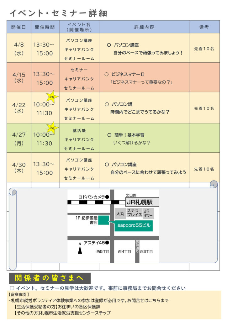お知らせ 2026年4月の体験イベント・講座のお知らせ 2026.03.18 お知らせ 4月の就ボライベント・講座スケジュールをお知らせします。 毎月のイベントのお知らせは体験イベントページでもご確認いただけます。 ご見学だけでも大歓迎ですので、詳しくは事務局までお問い合わせください。 PDFファイルをダウンロード Post Share Hatena Pocket RSS feedly Pin it 記事のタイトルとURLをコピーする 2026年3月の体験イベント・講座のお知らせ 前の記事 関連記事 5月の就ボライベント・セミナーのお知らせ 2025.05.01 8月の就ボライベント・セミナーのお知らせ 2025.07.07 9月24日体験イベント変更のお知らせ 2025.09.12 R7年4月のイベントのお知らせ 2025.04.17 2026年3月の体験イベント・講座のお知らせ 2026.02.04 12月の体験イベント・講座のお知らせ 2025.10.28 2026年1月の体験イベント・講座のお知らせ 2025.12.04 ホームページ公開のお知らせ 2025.04.14